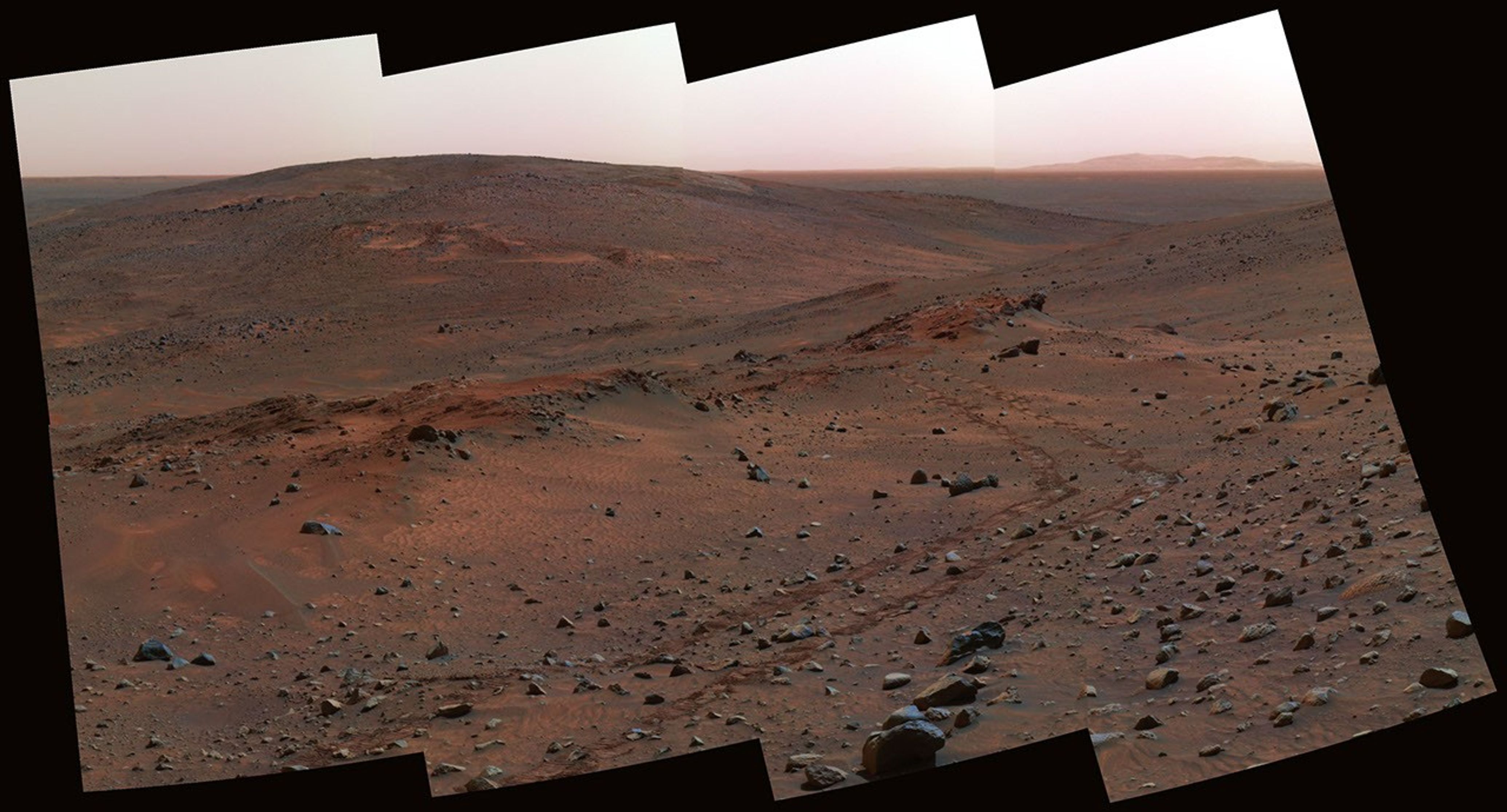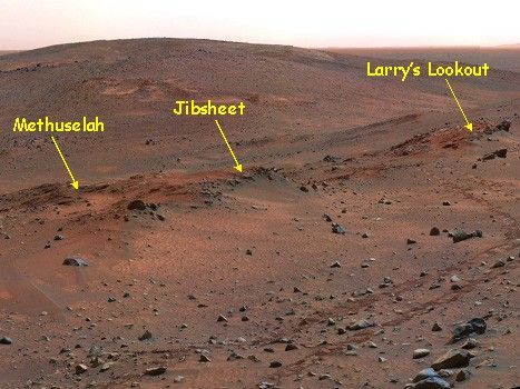 Three outcrops near each other on the flank of "Husband Hill" inside Gusev Crater are labeled on this false-color view assembled from frames taken by the Mars Exploration Rover Spirit's panoramic camera on the rover's 454th martian day, or sol (April 13, 2005).