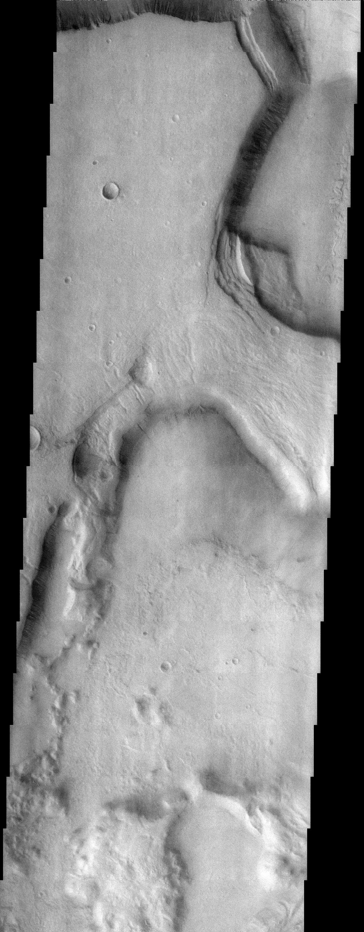 Named for a great river in Africa, the martian version is a system of eroding channels that empties into the Hellas impact basin. One style of erosion is evident in this image, where the upper branches of the Niger are merging. Some process weakens the crust until it founders, producing large slump blocks that continue to erode. This process enlarges the channels and ultimately may lead to a single upper channel.