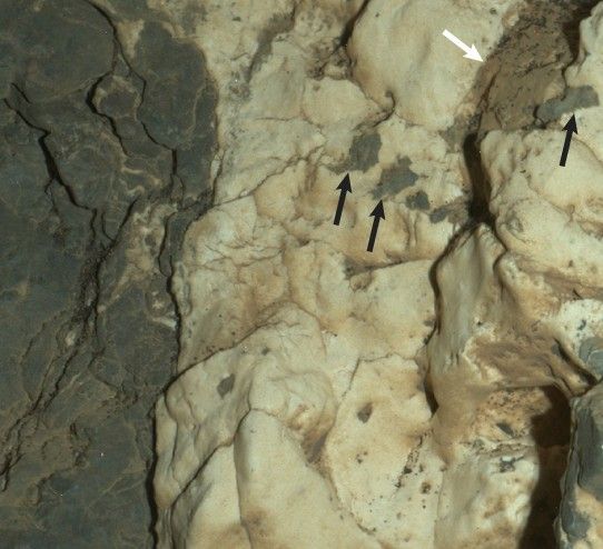 The vein includes both light-toned and dark-toned materials. The whiter material appears to have ripped up and incorporated portions of both the darker vein material (black arrows in Figure 1) and a third material (white arrow in Figure 1). The Curiosity mission's examination of material in these veins may provide clues about multiple episodes of fluids moving through fractured rock at this site. The fluid movement through fractures occurred later than wet environmental conditions in which the host rock formed, before it hardened and cracked.