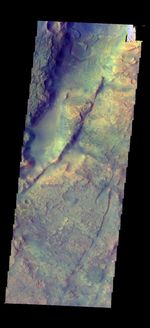 The THEMIS camera contains 5 filters. The data from different filters can be combined in multiple ways to create a false color image. These false color images may reveal subtle variations of the surface not easily identified in a single band image. Today's false color image shows part of Nili Fossae.