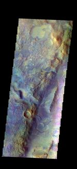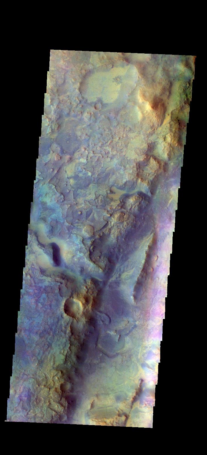 The THEMIS camera contains 5 filters. The data from different filters can be combined in multiple ways to create a false color image. These flase color images may reveal subtle variations of the surface not easily identified in a single band image. Today's false color image shows part of Nili Fossae.