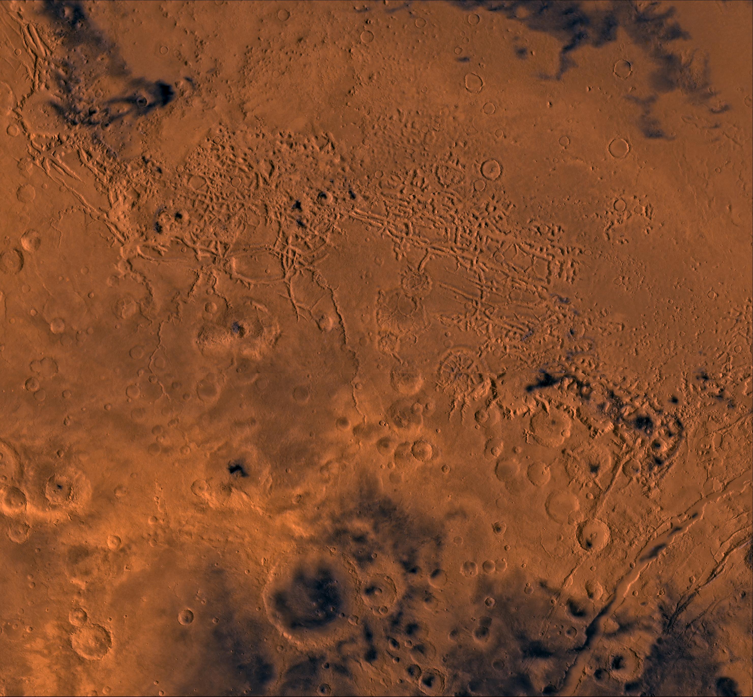 The dissected terrain along the highlands/lowlands boundary consist of the flat-floored valleys (mensae) and farther north the small, rounded hills of knobby terrain. Flows on the mensa floors contain striae that run parallel to valley walls; where valleys meet, the striae merge, similar to medial moraines on glaciers. Terraces within the valley hills have been interpreted as either layer rocks or wave terraces. The knobby terrain has been interpreted as remnants of the old, densely cratered highland terrain perhaps eroded by mass wasting. Auqakuh and Huo Hsing Valles and Nili Fossae are fretted channels and linear depressions that likely formed by sapping and mass wasting along lines of structural weakness.