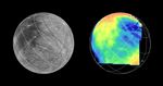 The Near Infrared Mapping Spectrometer (NIMS) on the Galileo spacecraft imaged most of Europa, including the north polar regions, at high spectral resolution at a range of 156,000 km (97,500 miles) during the G1 encounter on June 28 1996. The image on the right shows Europa as seen by NIMS, centered on 25 degrees N latitude, 220 W longitude. This is the hemisphere that always faces away from Jupiter. The image on the left shows the same view point from the Voyager data (from the encounters in 1979 and 1980). The NIMS image is in the 1.5 micron water band, in the infrared part of the spectrum. Comparison of the two images, infrared to visible, shows a marked brightness contrast in the NIMS 1.5 micron water band from area to area on the surface of Europa, demonstrating the sensitivity of NIMS to compositional changes. NIMS spectra show surface compositions ranging from pure water ice to mixtures of water and other minerals which appear bright in the infrared.