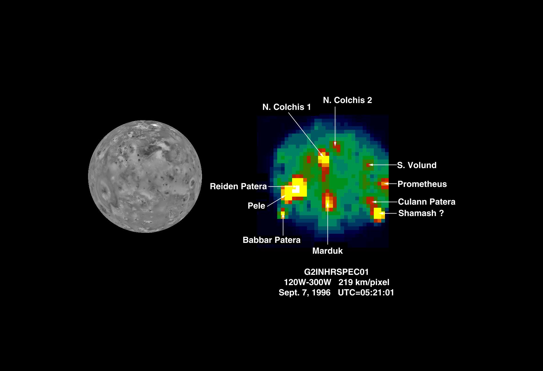 At least 10 hotspots have been identified and can be matched with surface features. An accurate determination of the position of the hotspot in the vicinity of Shamash Patera is pending. Hotspots are seen in the vicinity of Prometheus, Volund and Marduk, all sites of volcanic plume activity during the Galileo encounters, and also of active plumes in 1979. Temperatures and areas have been calculated for the hotspots shown. Temperatures range from 828 K (1031 F) to 210 K (- 81.4 F). The lowest temperature is significantly higher than the Io background (non-hotspot) surface temperature of about 100 K (-279 F). Hotspot areas range from 6.5 square km (2.5 sq miles) to 40,000 sq km (15,400 sq miles). The hottest hotspots have smallest areas, and the cooler hotspots have the largest areas. NIMS is continuing to observe Io to monitor volcanic activity throughout the Galileo mission.