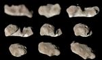 This set of color images of asteroid 243 Ida was taken by the imaging system on the Galileo spacecraft as it approached and raced past the asteroid on August 28, 1993. These images were taken through the 4100-angstrom (violet), 7560-angstrom (infrared) and 9680- angstrom (infrared) filters and have been processed to show Ida as it would appear to the eye in approximately natural color. The stark shadows portray Ida's irregular shape, which changes its silhouetted outline when seen from different angles. More subtle shadings reveal surface topography (such as craters) and differences in the physical state and composition of the soil ("regolith"). Analysis of the images show that Ida is 58 kilometers long and 23 kilometers wide (36 x 14 miles). Ida is the first asteroid discovered to have a natural satellite, Dactyl (not shown here). Both Ida and Dactyl are heavily cratered by impacts with smaller asteroids and comets, including some of the same populations of small objects that bombard Earth. These data, combined with reflectance spectra from Galileo's near-infrared mapping spectrometer, may allow scientists to determine whether Ida is a relatively unaltered primitive object made of material condensed from the primordial Solar Nebula at the origin of the Solar System or whether it has been altered by strong heating--evidence interpreted so far suggests that Ida is a piece of a larger object that has been severely heated. Whereas heating and melting of large planets is well understood, the cause of heating of small asteroids is more enigmatic--it may have involved exotic processes that occurred only for a short time after the birth of the Sun and its planets.
