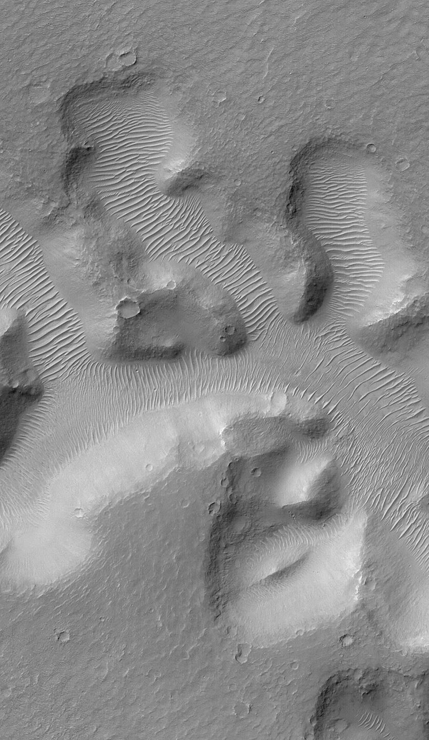 Nirgal Vallis is a narrow valley system that stretches approximately 420 kilometers (260 miles) across the martian surface near 28°S latitude, north of the large basin, Argyre. The floor of the valley system is largely covered with light-toned dunes and ripples. These windblown features obscure most of the original morphology of the valley floor. This view of a small portion of Nirgal Vallis was obtained by the Mars Global Surveyor (MGS) Mars Orbiter Camera (MOC) during Extended Mission subphase E02 on March 29, 2001. In each short tributary valley, dunes have a somewhat different orientation compared to those in the other valleys. The dune patterns here indicate that winds are locally controlled by the shape and orientation of each valley. The dunes just left of the center of the image have small craters on them, formed by meteor impact. The craters indicate that the dunes are not fresh, modern features, but are considerably older than they might at first seem. This image covers an area 3 km (1.9 mi) wide and is illuminated from the upper left.