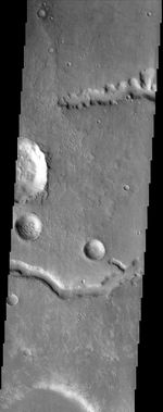 Note: this THEMIS visual image has not been radiometrically nor geometrically calibrated for this preliminary release. An empirical correction has been performed to remove instrumental effects. A linear shift has been applied in the cross-track and down-track direction to approximate spacecraft and planetary motion. Fully calibrated and geometrically projected images will be released through the Planetary Data System in accordance with Project policies at a later time.