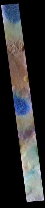 The THEMIS VIS camera contains 5 filters. The data from different filters can be combined in multiple ways to create a false color image. These false color images may reveal subtle variations of the surface not easily identified in a single band image. Today's false color image shows dunes in several craters in Noachis Terra. As with other craters in this region, large mounds of sand dunes are located on the crater floors. Wind directions that blow from east south east to west north west (lower right corner to upper left corner of the image) are arising from Hellas Planitia.