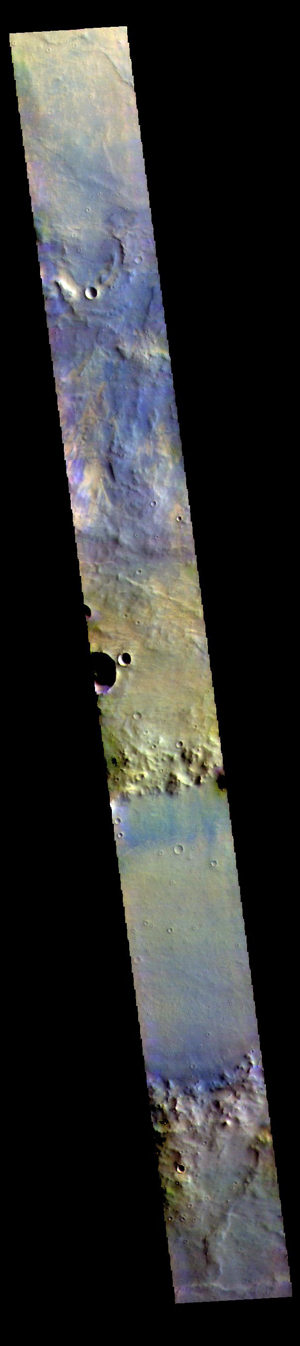 The THEMIS VIS camera contains 5 filters. The data from different filters can be combined in multiple ways to create a false color image. These false color images may reveal subtle variations of the surface not easily identified in a single band image. Today's false color image shows part of Noachis Terra.