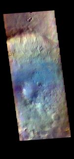 The THEMIS VIS camera contains 5 filters. The data from different filters can be combined in multiple ways to create a false color image. These false color images may reveal subtle variations of the surface not easily identified in a single band image. Today's false color image shows an unnamed crater in Noachis Terra.