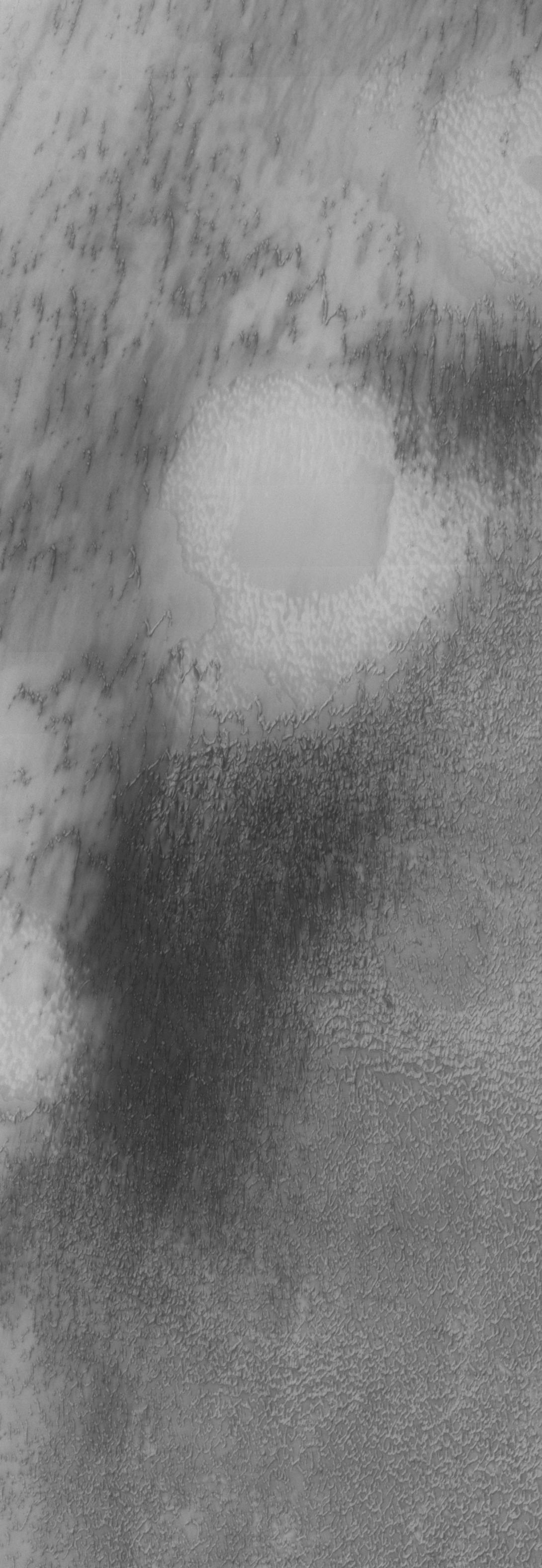 This VIS image was taken at 81 degrees North latitude during Northern spring. This region of the north polar erg is dominated by a different form of dunes than yesterday's image.