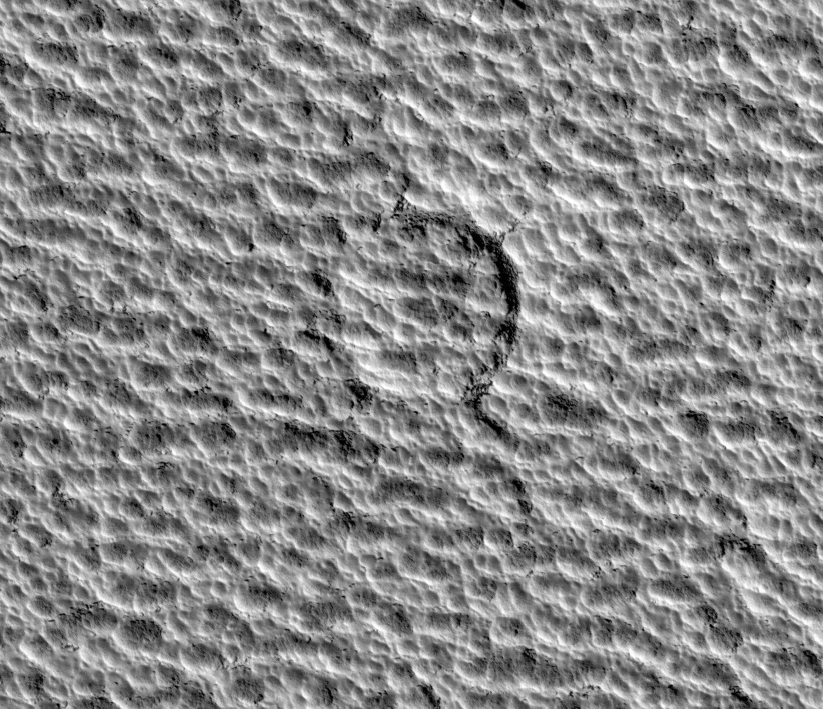 In this HiRISE image, the north polar permanent ice cap covers polar layered deposits and is one of the youngest formations on Mars. Despite being nearly a million square kilometers in area (about twice the size of California) there are very few impact craters known to exist on its surface. This image shows what is currently the largest known of these craters, about 80 meters (262 feet) across. The crater is heavily degraded and has almost been completely erased. Planetary surfaces accumulate craters over time and scientists use the abundance of craters of different sizes to estimate the age of the surface. The lack of craters on the permanent ice cap indicates that it is being resurfaced very quickly. This resurfacing may be due to either deposition or removal of ice. Surrounding and overprinted on the crater is the usual scalloped texture of the ice cap. These ice pits may be currently forming due to ablation (evaporation and wind erosion).