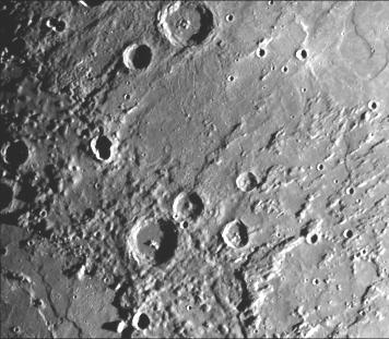 This image of the northeastern quadrant of the Caloris basin shows the smooth hills and domes between the inner and outer scarps and the well-developed radial system east of the outer scarp. This image (FDS 193) was taken during the spacecraft's first encounter with Mercury.