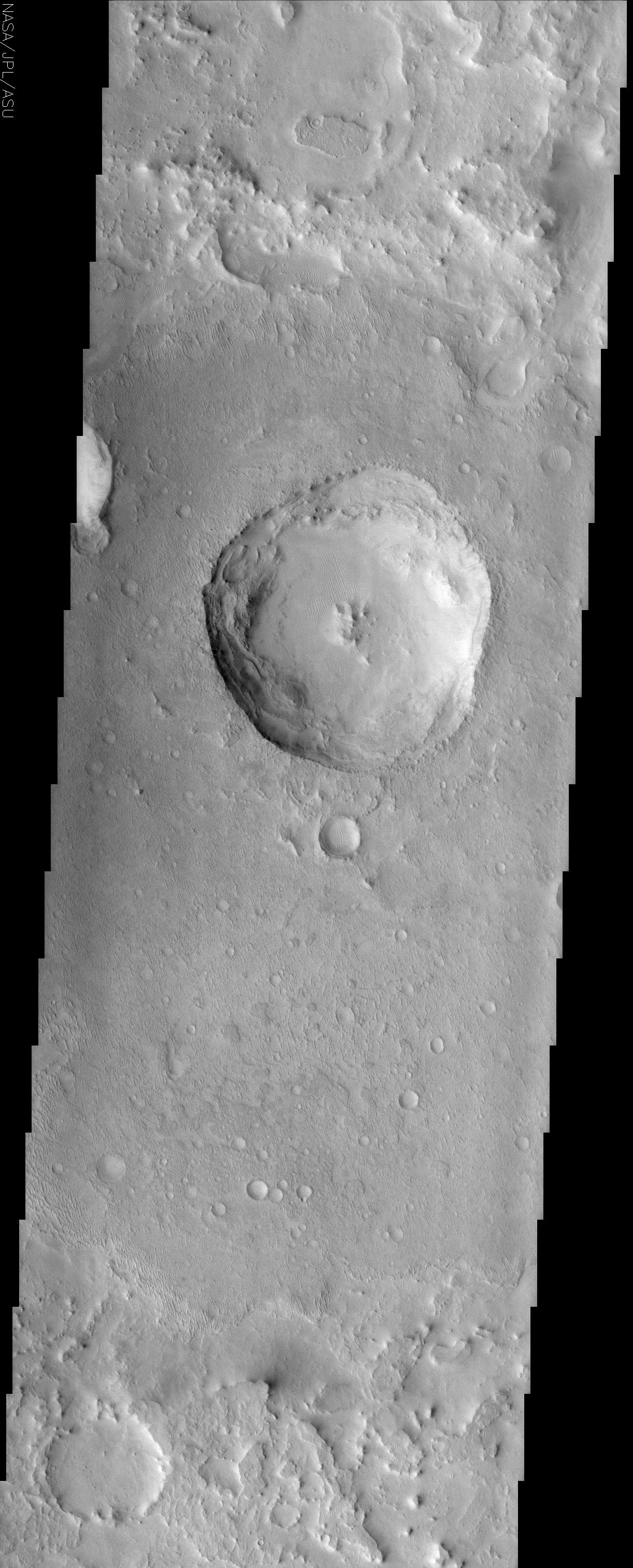 What's interesting about this crater is that it doesn't have typical features known to many craters: it isn't nice-and-neatly round and its raised rim is barely noticeable. That's because there's been a whole lot of depositing and eroding going on here too. After the impact crater formed, it was probably entirely buried by deposits over time. In fact, it was probably buried long enough for the overlying material to be eroded into the texture seen today. At some point, the load on top foundered and collapsed into the crater.