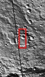 What we can also see in this image is a six-mile-wide crater. If you look at the context image to the right, you can see that it is actually a crater within a crater. The larger crater is about 24 miles wide in diameter. (Students! How many times bigger is the larger crater than the one that lies inside of it? If you look at the context image, you can get a really good sense of what "four times bigger" really means.)