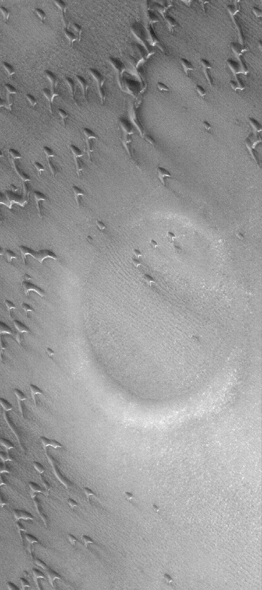This Mars Global Surveyor (MGS) Mars Orbiter Camera (MOC) image shows a partially-buried crater in the north polar region of Mars. The circular feature is surrounded and partly overlain by some of the many, many sand dunes in the area. The steepest slopes on each dune -- their slip faces -- face toward the southeast (lower right), indicating that the dominant winds responsible for sand transport in this region come from the northwest (upper left). In summer, the dunes in this scene would be darker than their surroundings, but in this northern springtime image, the dunes and everything else in the area are covered by carbon dioxide frost. The frost is left over from the winter which ended in January 2006.