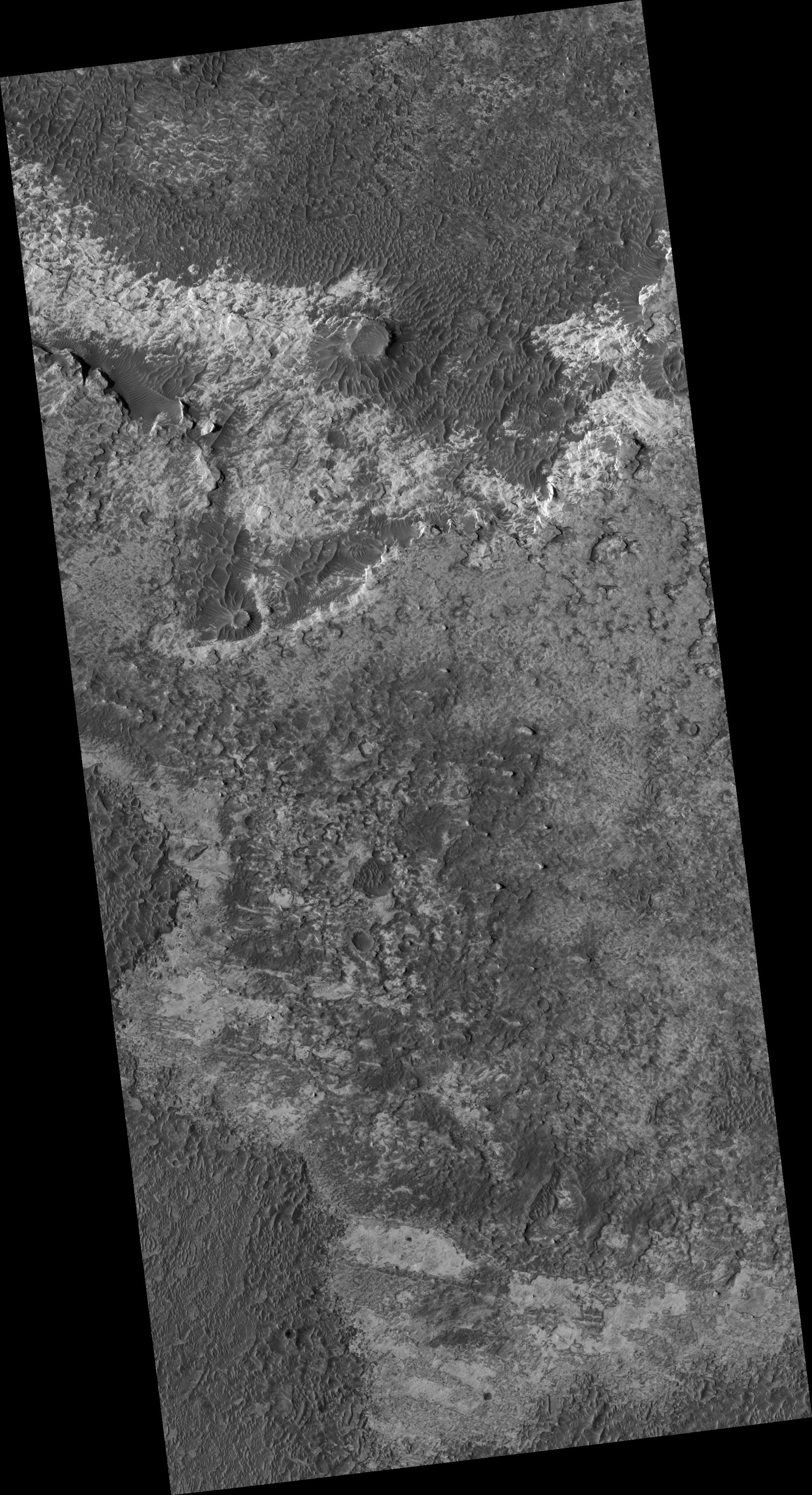 The Etched Terrain in this image is split into two units. The darker unit at the top of the image is filling in a ~120 km NW-SE trending valley, while the brighter Etched Terrain in the middle of the image is stratigraphically and topographically higher than the lower Etched Terrain in the valley. This upper Etched Terrain is a plateau-forming unit with a geomorphic pattern that ranges from relatively flat plains to dissected plateaus and mesas. The lower Etched Terrain is flat with low albedo, and covered in dunes.