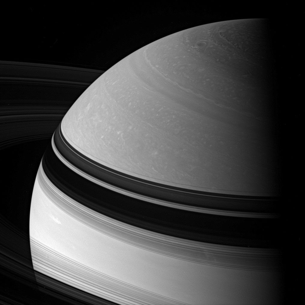 Incredible swirling details in Saturn's northern clouds can be seen in this dazzling view. Shadows cast by the rings embrace the northern hemisphere.