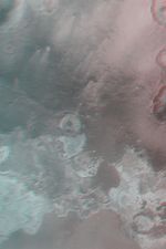 This is a stereo (3-d anaglyph) composite of Mars Global Surveyor (MGS) Mars Orbiter Camera (MOC) wide angle images of northern Sinus Meridiani near 2°N, 0°W. The light-toned materials at the south (bottom) end of the picture are considered to be thick (100-200 meters; 300-600 ft) exposures of sedimentary rock. Several ancient meteor impact craters are being exhumed from within these layered materials. To view in stereo, use "3-d" glasses with red over the left eye, and blue over the right. The picture covers an area approximately 113 km (70 mi) wide; north is up.