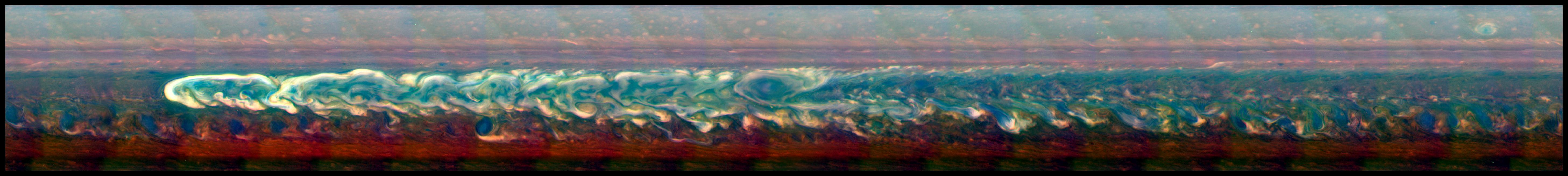 This mosaic of images from NASA's Cassini spacecraft shows the trail of a great northern storm on Saturn raging in full force. The contrast in the images has been enhanced to make the turbulent parts of the storm (in white) stand out without losing the details of the surrounding regions.
