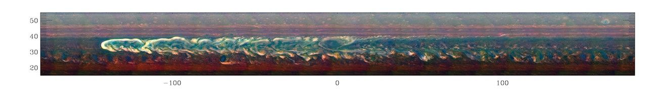 In this image, scientists assigned red, green and blue channels to those visible-light colors. However, this view is not what a human eye would see at Saturn -- in enhancing the contrast, the natural color balance was not preserved. To human eyes, storm would have appeared more like a bright feature against a yellow background with less color variation, as is seen in PIA16724. In this color scheme, the brightness generally corresponds to the altitude of the cloud features. Bright white indicates highest cloud tops in the troposphere, and dark places indicate holes in the cloud layer. The subtle colors that become apparent in this enhanced-contrast view are probably produced by variation in the composition of clouds. However, the coloring agents responsible for producing these subtle hues remain unidentified.
