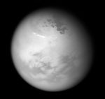 NASA's Cassini spacecraft sees bright methane clouds drifting in the summer skies of Saturn's moon Titan, along with dark hydrocarbon lakes and seas clustered around the north pole.