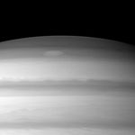 A large cloud formation swirls through the high northern latitudes of Saturn near the top of this Cassini spacecraft image.
