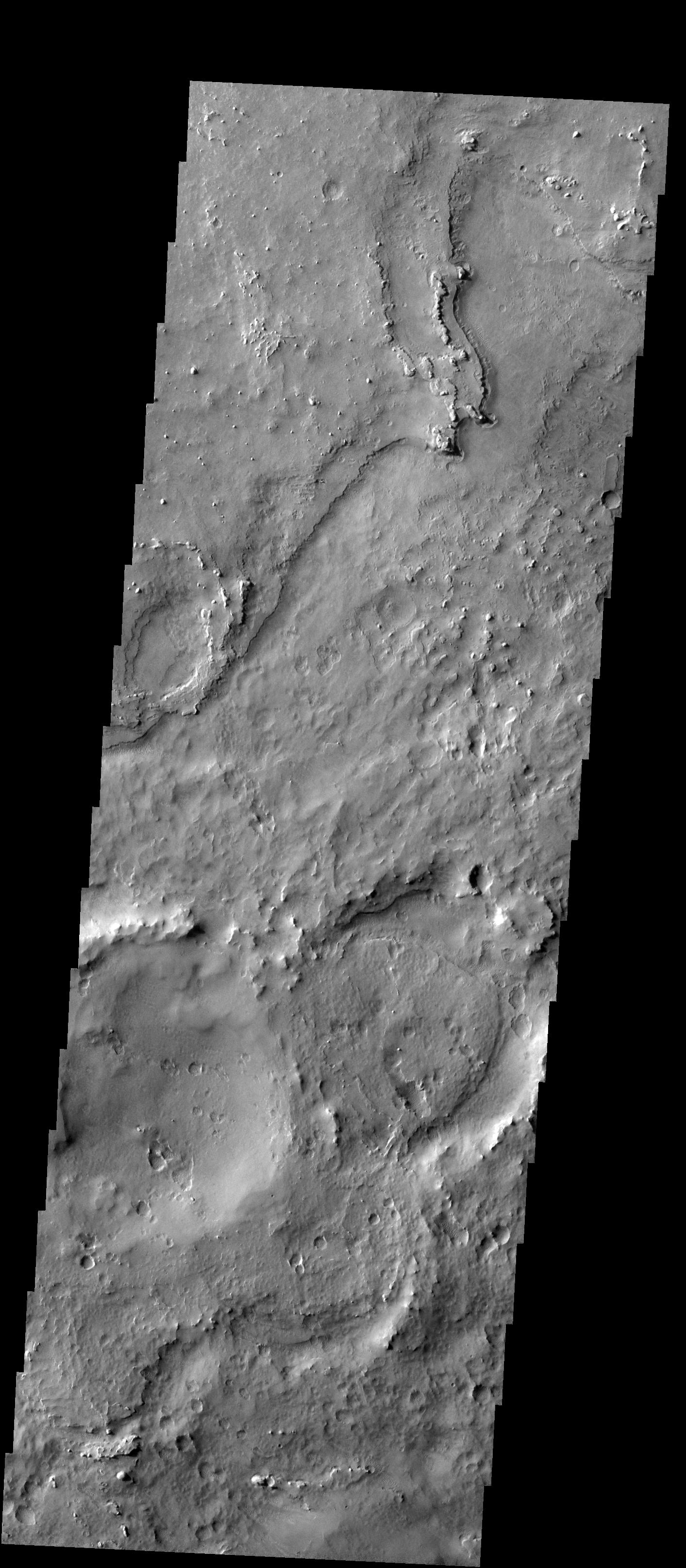 Note: this THEMIS visual image has not been radiometrically nor geometrically calibrated for this preliminary release. An empirical correction has been performed to remove instrumental effects. A linear shift has been applied in the cross-track and down-track direction to approximate spacecraft and planetary motion. Fully calibrated and geometrically projected images will be released through the Planetary Data System in accordance with Project policies at a later time.