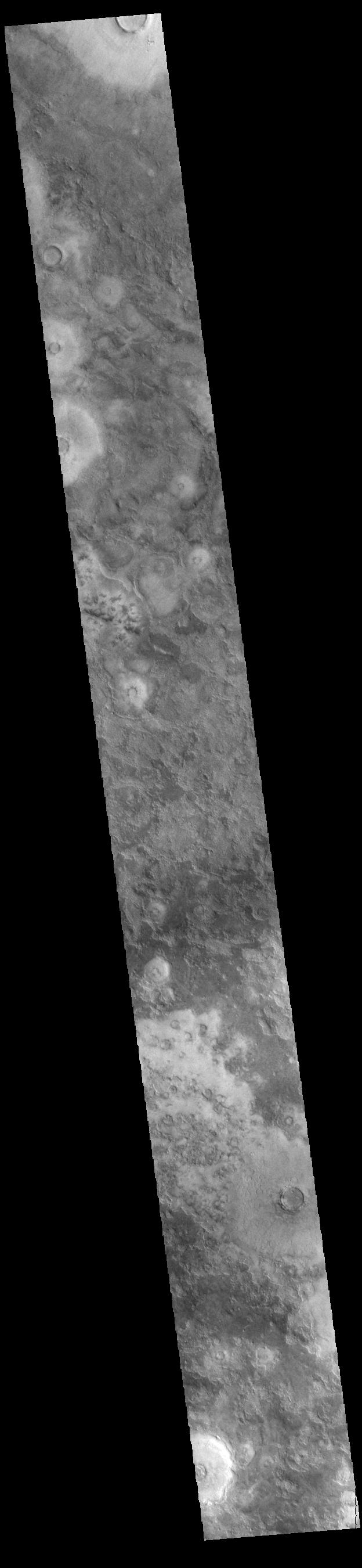 It is often said that the northern lowlands of Mars are bland when compared to the interesting surfaces in the southern highlands and large volcanic complexes. As this VIS image shows, the northern lowlands are complex surfaces with craters of all sizes, layering, dust devil tracks and other erosional features.