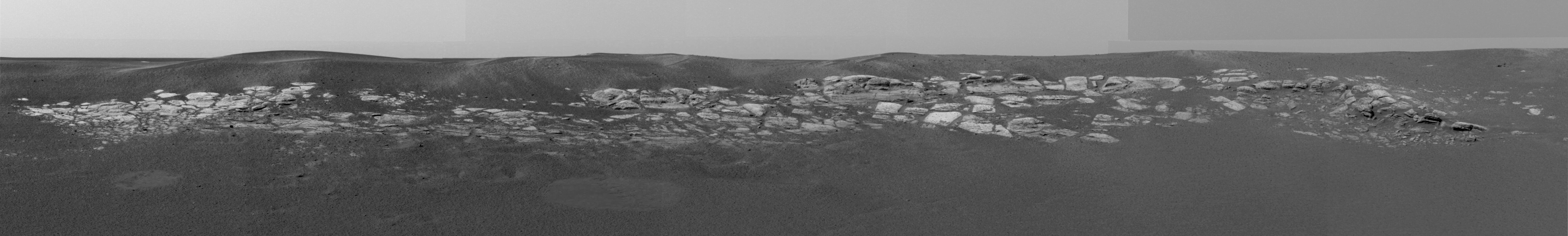 This sweeping look at the unusual rock outcropping near the Mars Exploration Rover Opportunity was captured by the rover's left panoramic camera. Scientists believe the layered rocks are either volcanic ash deposits, or sediments laid down by wind or water. Opportunity landed at Meridiani Planum, Mars on January 24 at 9:05 p.m. PST.