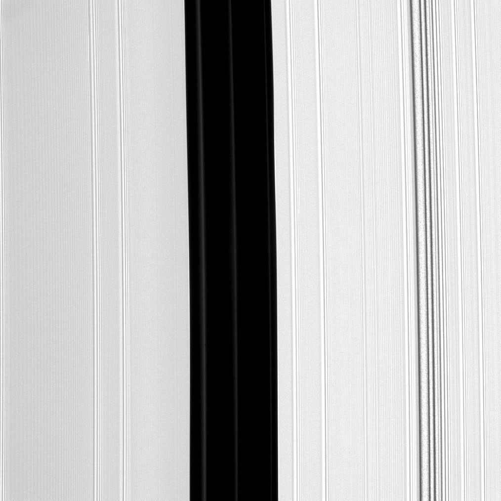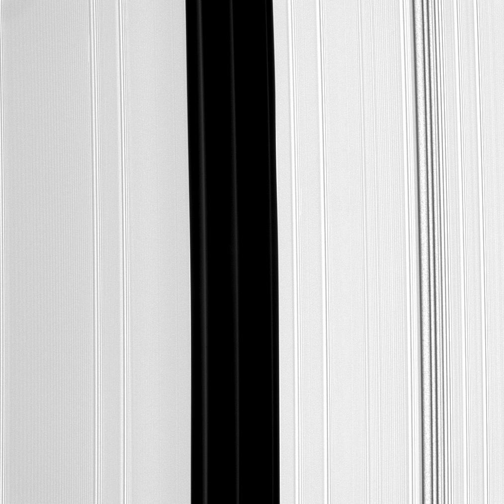The Encke Gap, the broad, vertical dark band running down the center of this image, is maintained by the small moon Pan (not pictured). Pan also shepherds three ringlets, all of which appear here as faint, narrow bands within the Encke Gap.