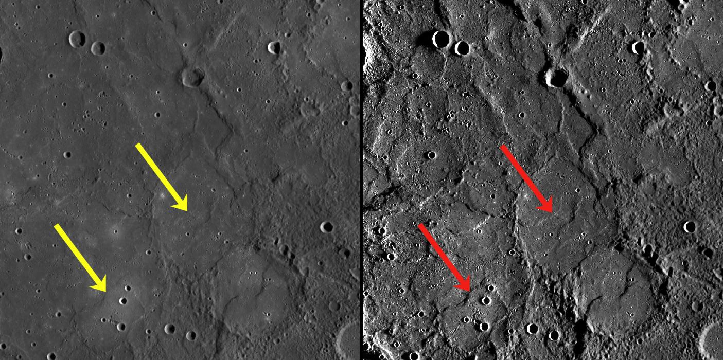 The high-incidence-angle base map is a major mapping activity in MESSENGER's extended mission and complements the surface morphology base map of MESSENGER's primary mission, which was acquired under generally more moderate incidence angles. High incidence angles, achieved when the Sun is near the horizon, result in long shadows that accentuate the small-scale topography of geologic features. Therefore, landforms such as wrinkle ridges that may not be readily visible in the surface morphology basemap (yellow arrows) become more apparent with high-incidence-angle lighting (red arrows). The high-incidence-angle base map is being acquired with an average resolution of 200 meters/pixel.