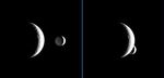Enceladus briefly passes behind the crescent of Rhea in these images, which are part of a "mutual event" sequence taken by Cassini. These sequences help scientists refine our understanding of the orbits of Saturn's moons.