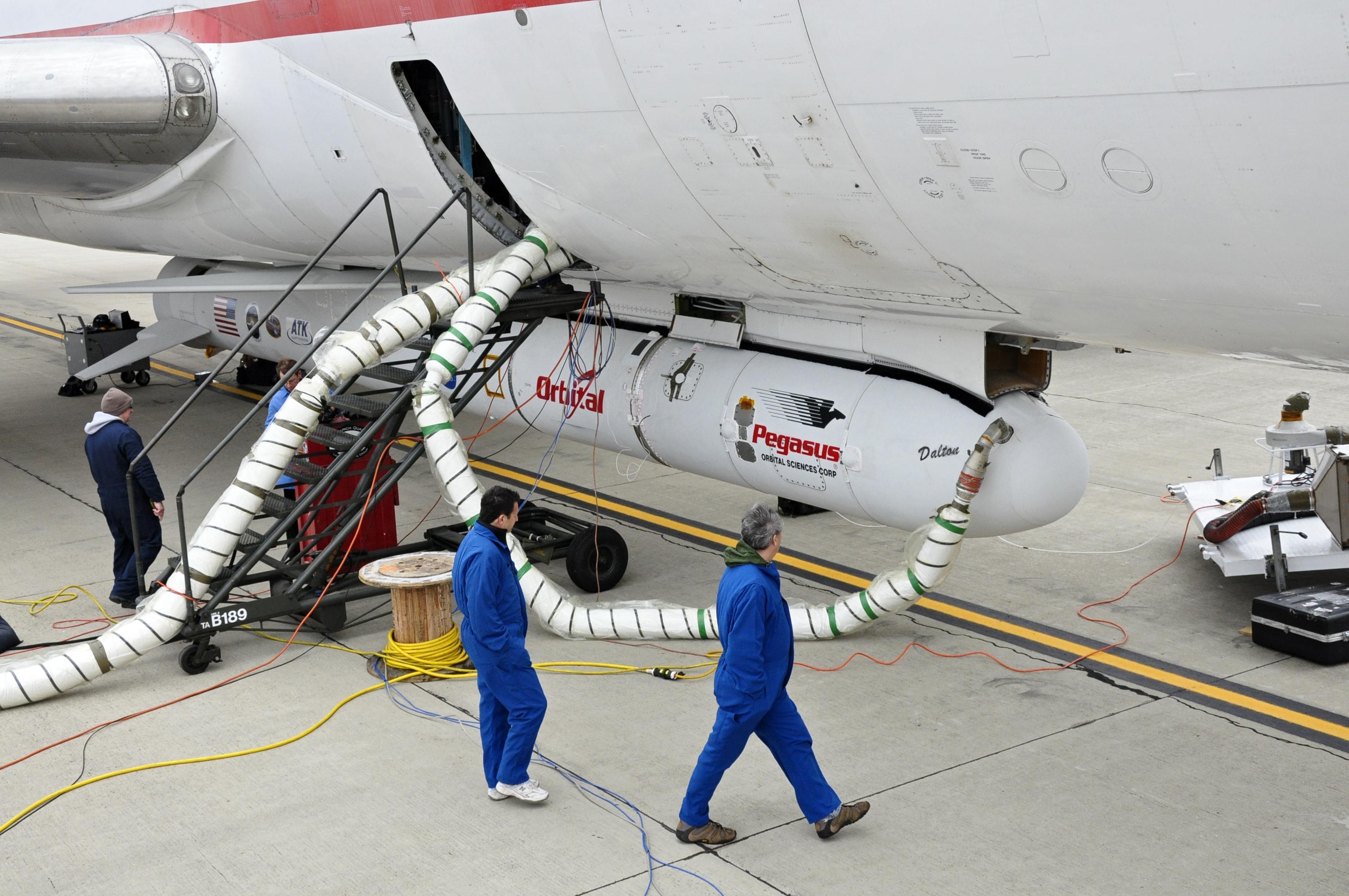 This photo shows the Orbital Sciences Corporation Pegasus XL rocket with the NuSTAR spacecraft after attachment to the L-1011 carrier aircraft known as "Stargazer." The Pegasus will launch NuSTAR into space, where the high-energy X-ray telescope will conduct a census for black holes, map radioactive material in young supernovae remnants, and study the origins of cosmic rays and extreme physics around collapsed stars.
