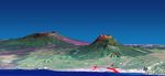 The Landsat image used here was acquired on December 11, 2001, about a month before the eruption, and shows an unusually cloud-free view of this tropical terrain. Minor clouds and their shadows were digitally removed to clarify the view, topographic shading derived from the SRTM elevation model was added to the Landsat image, and a false sky was added.