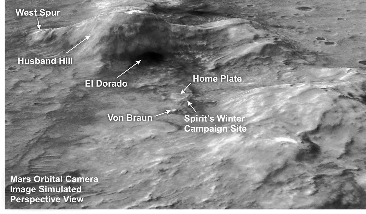 This perspective view looking toward the northeast shows part of the Columbia Hills range inside Gusev Crater. At the center is the winter campaign site of NASA's Mars Exploration Rover Spirit.