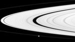 Saturn's narrow F ring partly obscures the small moon Epimetheus. Interior to the F ring is the bright A ring.