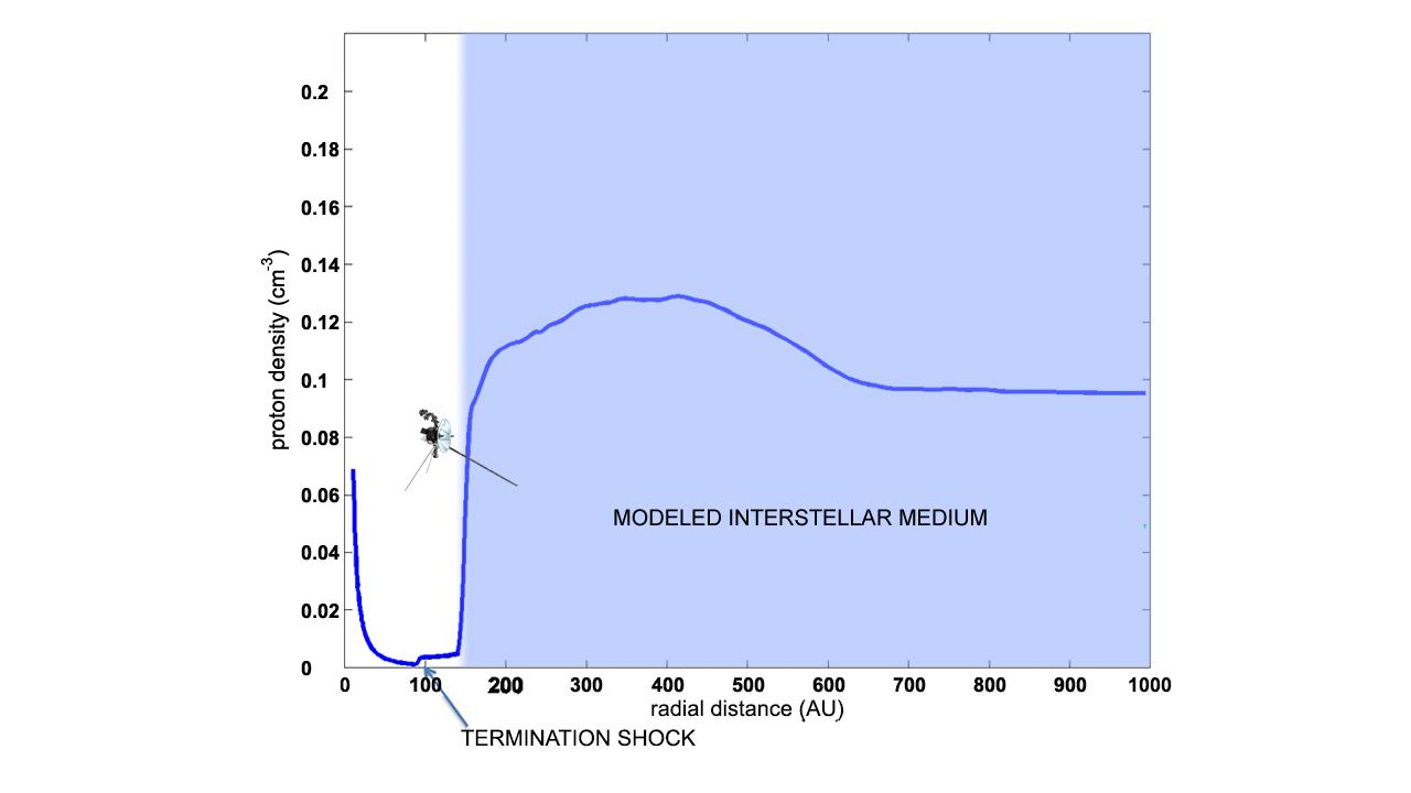 The blue line is a theoretical model showing how the density of particles decreases within the heliosphere as the distance from the sun increases, followed by a comparatively small increase in particle density, which was seen when Voyager 1 and 2 crossed the heliospheric termination shock. An enormous jump in the plasma density occurs at the transition from the heliosphere to the interstellar medium.