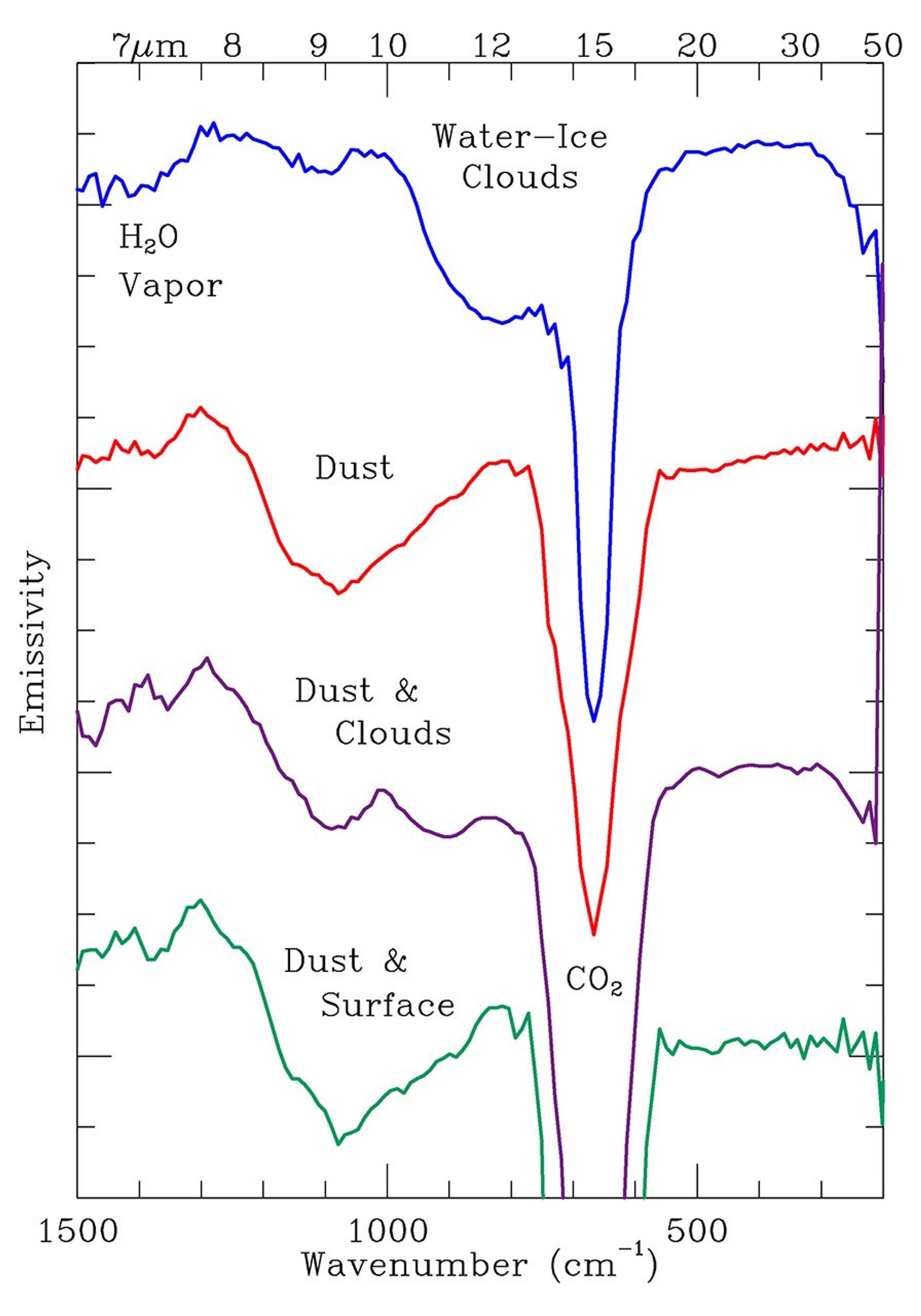 Surface, atmospheric dust, and atmospheric water-ice clouds have been observed as approximate spectral end-members as well as in combinations. Note the deep 15-micron line for atmospheric CO2 and the near 7 micron water vapor lines.