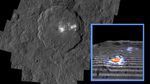 The center of Ceres' mysterious Occator Crater is the brightest area on the dwarf planet. The inset perspective view is overlaid with data concerning the composition of this feature: Red signifies a high abundance of carbonates, while gray indicates a low carbonate abundance.