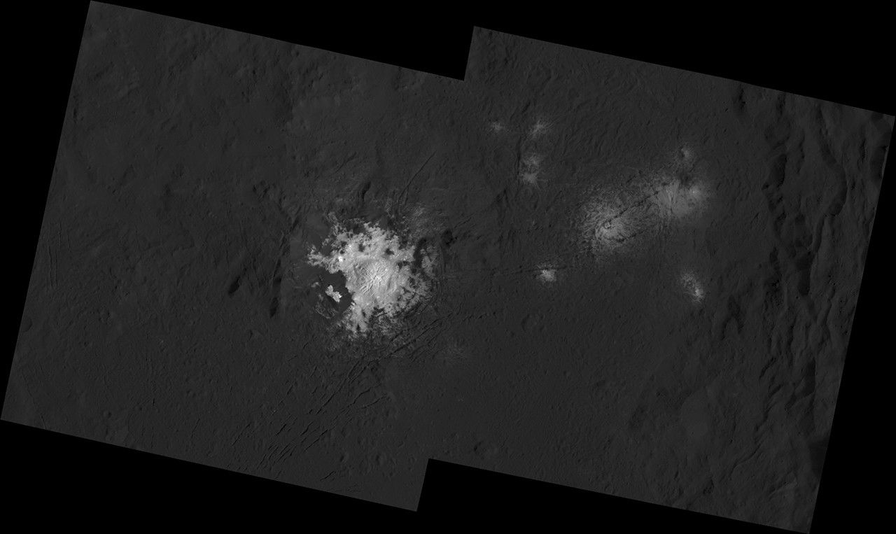 A separate figure shows the bright spots in a mosaic of two Dawn images taken using a shorter exposure time. The shorter exposure reveals details within the bright features that are overexposed, or nearly so, in the full mosaic.