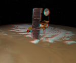 NASA's Mars Odyssey spacecraft passes above Mars' south pole in this artist's concept illustration. This red-blue anaglyph artwork can be viewed in 3-D on your computer monitor or in color print form by wearing red-blue (cyan) 3-D glasses.