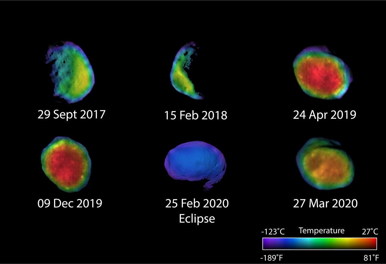 Chronologically, the views represent waxing, waning and full views of the moon. On Feb. 25, 2020, Phobos was observed during a lunar eclipse, where Mars' shadow completely blocked sunlight from reaching the moon's surface. This provided some of the coldest temperatures measured on Phobos to date: The coldest measured was about minus189 degrees Fahrenheit (minus123 degrees Celsius). On March 27, 2020, Phobos was observed exiting an eclipse, when the surface was still warming up.