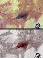 The top panel is from MISR's vertical-viewing (nadir) camera. Vegetated areas appear red here because this display is constructed using near-infrared, red and blue band data, displayed as red, green and blue, respectively, to produce a false-color image. The bottom panel is a combination of two camera views of the same area and is a 3-D stereo anaglyph in which red band nadir camera data are displayed as red, and red band data from the 60-degree backward-viewing camera are displayed as green and blue. Both panels are oriented with north to the left in order to facilitate stereo viewing. Viewing the 3-D anaglyph with red/blue glasses (with the red filter placed over the left eye and the blue filter over the right) makes it possible to see the rising smoke against the surface terrain. This technique helps to distinguish features in the atmosphere from those on the surface. In addition to the smoke, several high, thin cirrus clouds (barely visible in the nadir view) are readily observed using the stereo image.