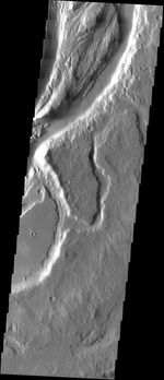 Mangala Vallis one of the large outflow channels that channeled large quantities of water into the northern lowlands, long ago on geological timescales. This valley is one of the few in the southern hemisphere, as well as one of the few west of the Tharsis bulge. A closer look at the channel shows more recent weathering of the old water channel: the walls of the channel show small, dark slope streaks that form in dusty areas; and much of the surrounding terrain has subtle linear markings trending from the upper left to the lower right, which are probably features sculpted and streamlined by the wind. Geology still shapes the surface of Mars today, but its methods over the eons have changed.