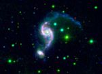 Arp 82 is an interacting pair of galaxies with a strong bridge and a long tail. NGC 2535 is the big galaxy and NGC 2536 is its smaller companion. The disk of the main galaxy looks like an eye, with a bright "pupil" in the center and oval-shaped "eyelids." Dramatic "beads on a string" features are visible as chains of evenly spaced star-formation complexes along the eyelids. These are presumably the result of large-scale gaseous shocks from a grazing encounter. The colors of this galaxy indicate that the observed stars are young to intermediate in age, around 2 million to 2 billion years old, much less than the age of the universe (13.7 billion years).