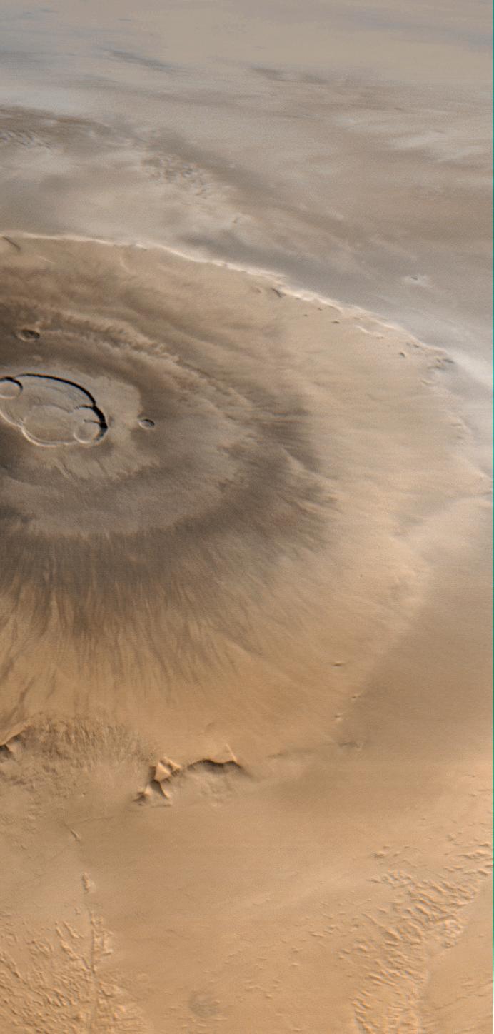 Olympus Mons is a mountain of mystery. Taller than three Mount Everests and about as wide as the entire Hawaiian Island chain, this giant volcano is nearly as flat as a pancake. That is, its flanks typically only slope 2° to 5°.