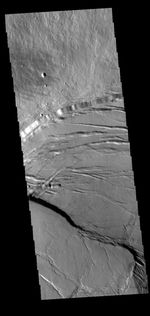 Today's VIS image shows part of the summit caldera of Olympus Mons. Scarps and extensional features (graben) record multiple stages of caldera collapse at the summit of Olympus Mons. Olympus Mons is the largest volcano in the solar system, reaching heights over 40 km (25 miles) tall from base to summit, with the base covering an area as large as the state of Arizona. For comparison, Mauna Loa is 9 km (5.5 miles) tall measured from its base on the sea floor.