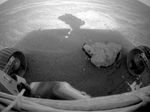 This image from the Mars Exploration Rover Opportunity front left hazard-avoidance camera shows a pebble caught in rover's front right wheel. The image from sol 63 of the mission was taken as the rover approached the rock dubbed "Bounce" for analysis.