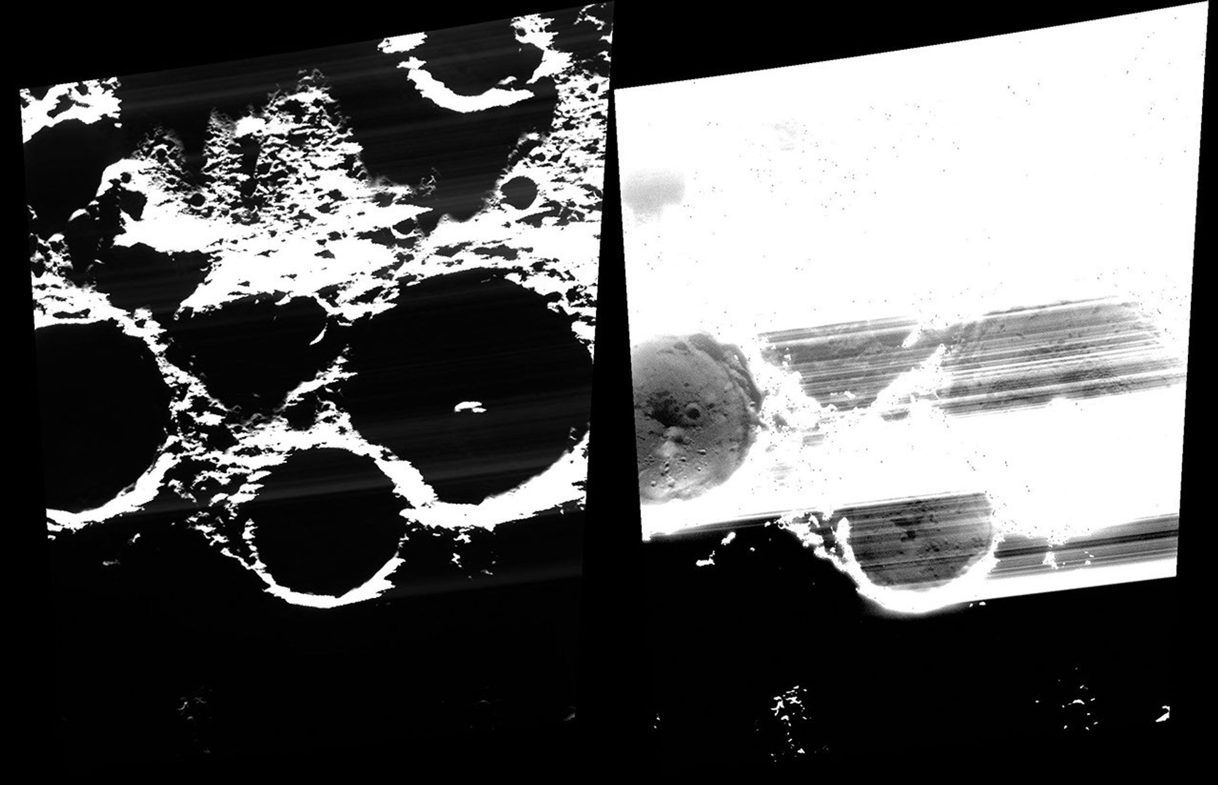 This image reveals the surfaces within some of Mercury's most prominent ice-bearing craters; from left to right, across the center of the image, the craters are Chesterton, Tryggvadóttir, and Tolkien. The same image is shown twice, but the one on the right has been stretched to reveal the permanently shadowed floors of the craters.